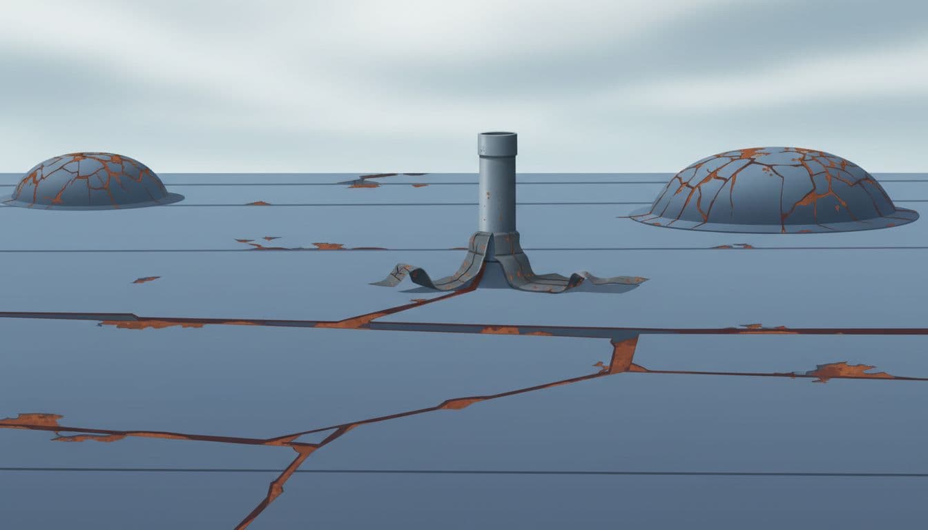 Seams are common leak points, especially after a winter with constant freeze-thaw motion. Check for separation, dried or missing lap sealant, and lifted edges around the roof perimeter.